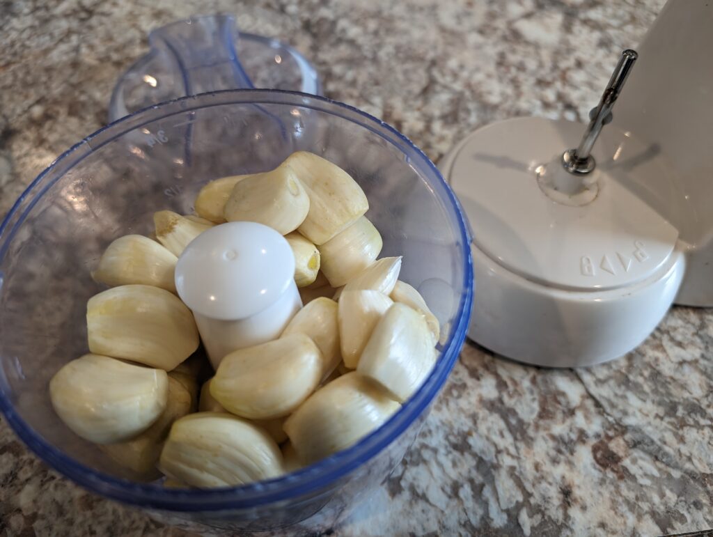 I busted and pulled the bulbs apart, and then snipped off the ends of each clove. This took a while. I put them in a big tumbler with a lid and shook them to loosen the peeling. You have to shake it pretty hard for it to work. I peeled them and added them to my chopper in batches, quickly filling a pint-sized jar. I added a little olive oil, not to drown them but to keep them wet…I was surprised at how dry the garlic was after chopping it up.