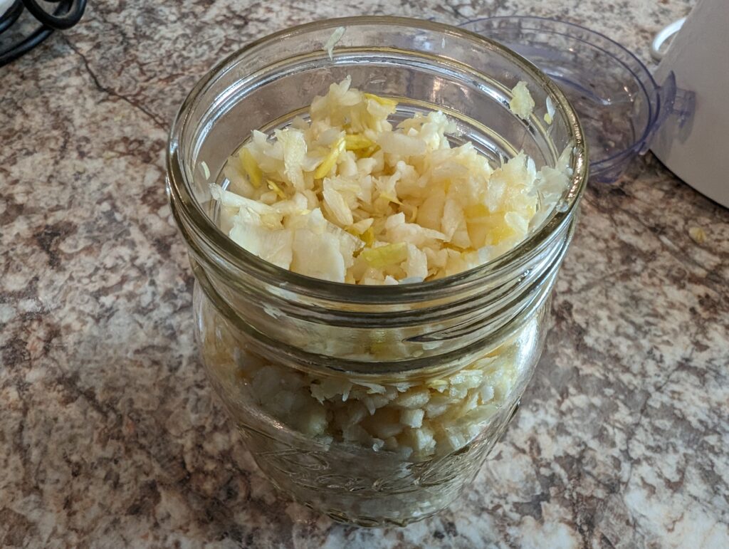 We’d planted more of the heat-tolerant garlic of course and we had a lot of extra. I wanted to store some of it for easier use and I’d heard that I could chop them up and store them in the fridge in a little olive oil, so I am giving that a try. I chopped up around 4 bulbs, and this filled a pint jar. By the way…garlic can sting your fingers if you have a hangnai,l so wear gloves!